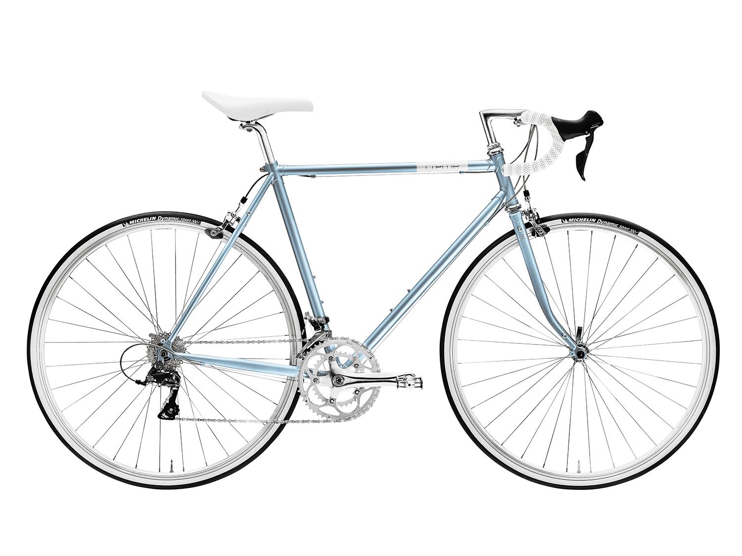 Gemuffter Stahlrahmen und -gabel, Shimano Claris Schaltwerk 2x8-Fach, Shimano Claris Umwerfer 2-Fach, Shimano Claris STI Schalthebel, Sunrace Kassette 8-Gang 11-32T, Aluminium Felgenbremse, Aluminiumkurbel 50/34T, Joytech-Naben, Michelin Dynamic Sport 700x28C Reifen, Doppelwandige Felgen, Edelstahlspeichen, Aluminium Pedale, Velo Sattel, 1 Vorbau, Aluminium Drop Bar